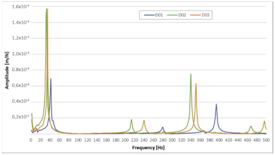 Based on the acquired results, the decision to assemble the final part of the prototype from the flax hybrid composite was made. The final prototype of the selected part was tested whilst directly mounted to the electric personal watercraft (see Figure 2a), as well as clamped to the bench vice. The RMS and sound noise levels for the samples were measured when mounted on the watercraft, and FRFs were measured when camped to the bench vice. The FRFs measurement showed that the best results were acquired for the D01 sample; the differences between the amplitudes and dominant frequencies for the D02 and D03 samples were negligible (Figure 12).