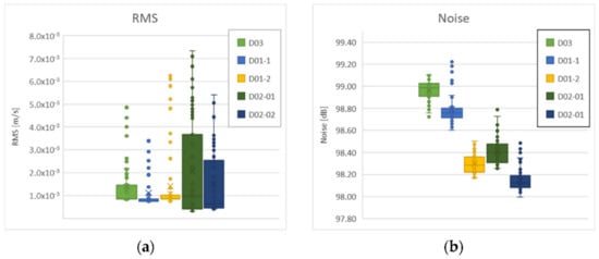 Final testing of the prototype parts mounted on the watercraft were performed for the maximum revolutions of the engine, i.e., 7200 RPM. The RMS and noise level were calculated for the frequency range of 0–3.2 kHz. The accelerometer was fixed by a special wax in the middle of the tested sample, see Figure 2a. The results of noise level are not conclusive because the prototype part is a small subcomponent that did not affect the results in a greater extent. The problems were instability of engine-speed fluctuations and poor measurement repeatability. The results of RMS measurement are shown in Figure 13a, and the noise levels are depicted in Figure 13b. The most advantageous RMS results were acquired for the D01-1 and D01-2 samples. This fact was in accordance with the results of the FRFs measurements of samples clamped in the bench vice. Assessment of noise level is typically performed under different conditions during on-water operation (especially for diesel engines) []. The herein acquired noise level was higher than recommended [], which can be attributed to the fact that the measurement was performed at high RMPs (more than 80% of maximum) in a closed room. The distance of the microphone and recorded frequencies could also have affected the result.