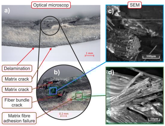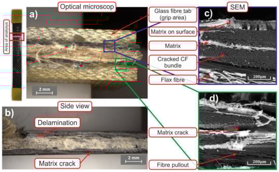 Microstructure of cracked tensile test sample—optical microscopy and SEM analysis, (a) top view, (b) side view (c) SEM image fracture area carbon–flax, (d) SEM image carbon bundle–matrix.