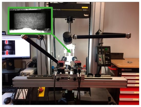 Displacements and strains in the sample were measured using 3 LVDTs (supplied by RDP Group, Le Spijkenisse, The Netherlands) and fixed on the steel bars. The displacements obtained from the LVDTs were corrected for bar compliance during compression. Additionally, a low-speed 3D DIC setup was used to locally measure the full-field displacements and strains on the sample surface. The optical setup consisted of two 5-megapixel machine vision cameras (stingray 504b by Allied Vision, Stadtroda, Germany) positioned under a stereo angle of 18.85°. Each camera was equipped with two lenses of 100 mm fixed focal length (Edmund Optics, York, UK). A black-on-white speckle pattern was applied to the surface of the samples prior to testing. During deformation, images of the speckled samples were recorded at a resolution of 2452 × 2056 pixels2. The average speckle size of the samples tested at quasi-static conditions was approx. 0.09 mm, which corresponds to 10 pixels on the images. In order to determine the intrinsic and extrinsic parameters of the 3D DIC system, a calibration was carried out using a small etched glass calibration grid, having 9 × 9 dots and a pitch of 1.34 mm between the centers of the dots. Figure 3 shows the quasi-static setup used. The average displacement resolutions were approx. 0.05 and 5 μm for in-plane and out-of-plane displacements, respectively, for the quasi-static 3D DIC system, and 0.18 μm for the LVDTs.