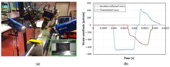 (a) High-speed 3D DIC setup used, with detail of the speckled sample (bottom right), (b) Example of the incident, the reflected, and the transmitted wave recorded on the Hopkinson bars during a dynamic compression experiment.