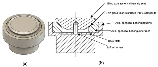 A novel self-alignment attachment was developed for the quasi-static and high strain rate compression tests, as shown in Figure 6. This attachment was developed in order to provide full contact between the loading surface of the bars and the specimen interfaces even if the specimen interfaces lack perfect parallelism. The attachment is based on a modified axial spherical plain bearing (INA GE30-AX), which was modified by changing its steel inner race to a blind spherical seat for the compression sample. The seat was cut from a metallic ball and matched the spherical cavity of the bearing’s outer race. The contact surface between the spherical seat and the bearing’s outer race was made of a thin layer of glass fiber reinforced PTFE composite to minimize friction. The seat and the outer race were kept in contact by means of a backplate and a small set screw. This prevents the spherical seat from falling off during loading. The contact surface between the backplate and the outer race was greased before assembly to minimize friction. The outer race was press-fitted into a metallic housing, in which sufficient clearances were considered to allow the spherical seat to move and accommodate the sample. For the high strain rate tests, the housing and the spherical seat were attached to the output bar. Additionally, they were made from aluminum to match the material of the output bar and minimize the impedance mismatch. Due to the unavoidable difference in the cross-sectional area in the housing and the different materials used, some small wave reflections were expected due to impedance mismatch. However, as shown in Figure 5b, only very small, negligible oscillations were observed in the transmitted signal. A thin steel platen was attached at the loading interface with the sample to avoid indentations in the aluminum seat. For the quasi-static testing, the same self-alignment attachment configuration was used, however, the parts made of aluminum were replaced by steel parts. For both the quasi-static and high strain rate tests, and to reduce barreling and interfacial friction, the loading interfaces with the sample were polished to a mirror finish, and carefully lubricated with a PTFE lubricant. Moreover, the centerlines of the samples and the bars were carefully aligned with a special alignment tool.