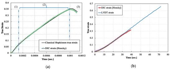 Figure 8a represents the true axial strain time history of one of the high strain rate compression experiments using the classical Hopkinson analysis Equation (11) and the true DIC axial strain. An excellent agreement was obtained between DIC and Hopkinson axial strains. The speckle pattern could not follow the deformation of the samples beyond approx. 35% true strain. Therefore, DIC strains were not reported beyond that limit. In the dynamic tests, the samples were deformed in approximately 1 ms. The progression of the strain with respect to time consisted mainly of three stages: (1) an initial stage with times ranging from 0 to ~100 μs, which included the establishment of the quasi-static stress equilibrium followed by the elastic response of the material, (2) a second stage in which a constant strain rate was established, starting from time ~100 μs and up to 1 ms, and (3) a third stage, after 1 ms, in which the strain decreased correspondingly to the unloading of the sample. None of the dynamically tested samples failed during the compression tests, and some elastic springback was observed in all samples. Consequently, the maximum strain reached in the dynamic tests cannot be considered the failure strain. For all dynamic tests, the average true strain rates corresponding to the elastic constants (i.e., elastic modulus and Poisson’s ratio) were calculated in the first stage, while the average true strain rates corresponding to yielding were calculated in the second stage. These average true strain rates were calculated as the slope of the true strain-time curve in the respective stages. The average strain rates achieved for all the dynamic compression tests were in the range of 285 to 1094 s−1.