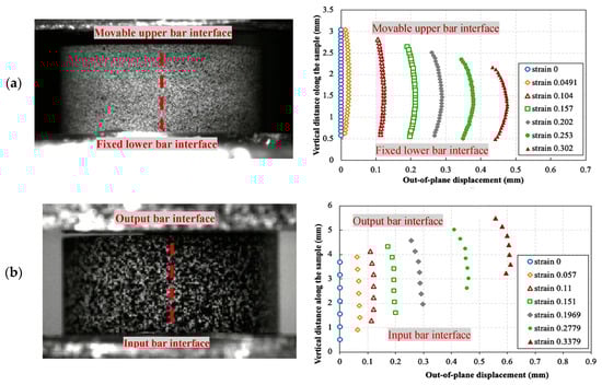 Out-of-plane (radial) displacement and vertical position of the vertical center line on the sample surface indicated in red at different levels of true axial strain: (a) during a quasi-static test, (b) during a high strain rate test.
