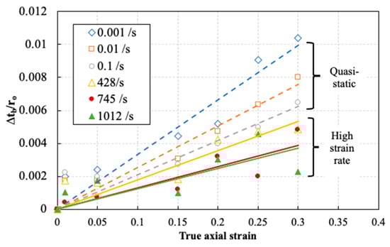 Figure 10 shows an example of the evolution of the barreling ratio as a function of true axial strain for several representative static and dynamic tests. The solid lines indicate a linear least square fit, with R2 values higher than 82%. The indicated strain rates correspond to the strain rate reached at the yielding stage. It can be seen that the barreling ratio increased during the progression of the compression tests. However, the barreling significantly decreased with increasing strain rate. Indeed, at a true axial strain of 0.3, the barreling ratio of approx. 1% obtained in the sample tested at the lowest strain rate, that is, 0.001 s−1, was reduced with a factor of approx. 5 to 0.2% in the sample tested at a strain rate of 1012 s−1. The overall low barreling ratios indicate good lubrication conditions with minimum barreling up to 0.3 true axial strain in all compression tests.