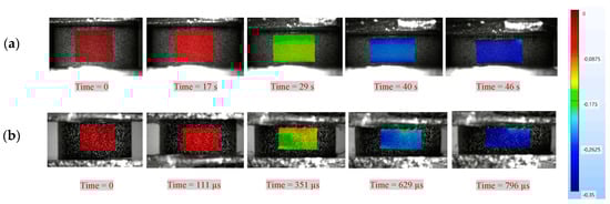 Figure 11 shows the evolution of the true axial compressive strain fields during a quasi-static experiment at a strain rate of 0.01 s−1 and a dynamic experiment with a strain rate of 428 s−1 at the yielding stage. The images were recorded during the deformation from time 0 to 46 s for the quasi-static experiment, and 0 to 796 µs for the high strain rate experiment. The color map indicates the strain levels measured on the surface of the sample, blue corresponds to the highest true strain of 0.35 and red to a true strain of 0. It can be seen that homogeneous strain fields developed at both the quasi-static and the high strain rate.