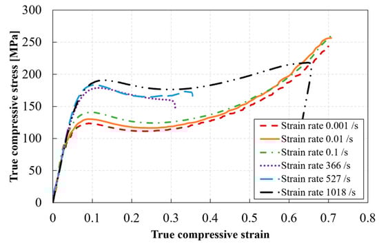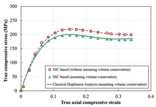 In order to assess the validity of the classical Hopkinson stress and strain calculation using Equations (2) and (3), the axial compressive true stress , assuming conservation of volume, was calculated from the stress obtained by Equation (3):