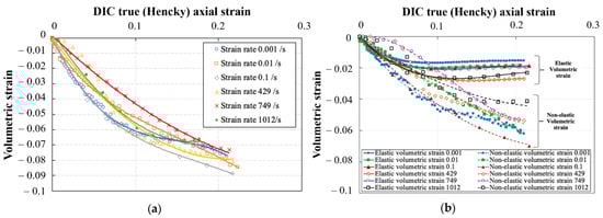 Figure 13a shows representative curves for the total volumetric strain (Equation (7)) obtained for quasi-static and high strain rate tests up to 0.2 axial strain. The indicated strain rates correspond to the strain rates at the yielding stage. As expected, the volume decreases as a function of imposed strain, for all strain rates. The reduction in volume is attributed to the compaction of the material as a result of the compressive hydrostatic pressure. The volume of the sample is reduced by approx. 3% to 6% at an axial strain of 0.07, which is roughly the average strain level at which the yielding of the material starts. At true axial strains higher than 0.07, the volume reduction rate is slightly reduced. The presence of this transition point indicates that the reduction in volume varies in the elastic and non-elastic stages of loading. Additionally, the strain rate does not have a significant effect on volume reduction. Figure 13b shows the elastic and non-elastic volumetric strains (Equation (8)) up to 0.2 axial strain. Both the elastic and non-elastic volumetric strains follow a similar trend in volume reduction up to strains approx. 0.07. Beyond axial strain of 0.07, the elastic volumetric strains show nearly plateauing behavior up to values of 1.5% to 2.5% of the total volume at all strain rates. Whereas the non-elastic volumetric strains show and increase to reach a maximum ranging between 4.5% to 7% of the total volume at all strain rates. The effect of strain rate on both the elastic and non-elastic volumetric strains is also not significant. The volumetric strains indicate that in the yield stage, and contrary to what is often assumed, a permanent volume change occurs. Similar results were reported by Jerabek et al. [11] for polypropylene in compression at quasi-static strain rates. However, in the yielding stage, the authors indicated that the material could experience either an increase or a decrease in the volume depending on the position at which the Poisson’s ratio was measured on the sample, and the stage at which the Poisson’s ratio was calculated. In the present study, the Poisson’s ratio used in Equation (8) was measured in the center of the sample, and extracted from the initial linear part of the stress–strain curve. Indeed, as evident from the DMA results in Figure 1, the tan delta—which is a direct measure of the viscous component of the material behavior—is nearly zero in the temperature range of 23 °C up to 150 °C. Additionally, as will be shown in Section 3.5, the elastic modulus and the Poisson’s ratio calculated in the linear part only seemed to be marginally affected by the strain rate. It is therefore assumed that the material response at the low deformation range is dominantly elastic rather than viscoelastic. Based on the previous analysis, the peak yield strength reported later in Section 3.4 is based on the stress–strain curves without the conservation of volume.