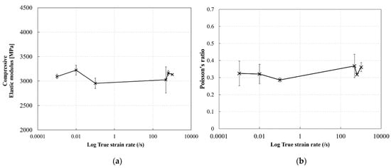 Figure 15 shows the effect of strain rate on the elastic modulus and Poisson’s ratio of the RTM6 epoxy resin. The compressive elastic modulus and Poisson’s ratio generally showed a constant behavior with increasing strain rate, that is, the differences are within the experimental scatter. The average value of compressive elastic modulus was approx. 3200 MPa, whereas the Poisson’s ratio was approx. 0.32. Similar results were reported by Morelle et al. [10] for an RTM6 epoxy at quasi-static strain rates, and by Fard et al. [4] for a similar epoxy system. Gerlach et al. [4] reported an increase in stiffness with the increase in strain rate for the RTM6 resin, which seems to contradict the current findings. This could be attributed to the fact that the strain rate range covered in the current study was more limited compared to the range in Gerlach’s work. Additionally, and as mentioned earlier, the DMA results revealed that the highly crosslinked RTM6 epoxy resin showed predominantly elastic behavior rather than viscoelastic behavior at the early stages of loading or at small strains. As a consequence, the resin material was expected to be independent of the strain rate at the initial elastic range due to the very small contribution of the damping component in the deformation at high strain rates.
