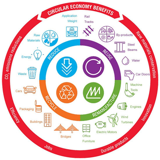 The utilization of waste materials follows the circular economy model pattern which covers the concept that waste from one source is a product of another source. The complete cycle of the circular economy model has been described by United Nations Conference on Trade and Development (UNCTAD) as shown in Figure 1. It explains the purpose as “A circular economy benefits both developed and developing countries, keeping materials longer in the economy could reduce by 33% the CO2 emissions embedded in products, mitigating emissions at lower costs than other strategies, and helping countries in their Paris and SDGs commitments” [52].