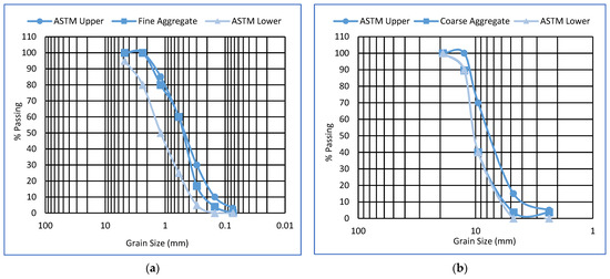 After the description of cementitious materials, the next one is fine and coarse aggregates. Locally available well-graded fine aggregates with a maximum size of 4.75 mm were used in this study. The maximum and minimum size of well-graded coarse aggregates is 12.5 mm and 4.75 mm, respectively, and originated from Sargodha, Pakistan. The physical characteristics of these aggregates are listed in Table 2 as per ASTM standards [60,61,62,63,64,65,66,67]. Tap water is used for the mixing of all these materials. Fine and coarse aggregate gradation curves are shown in Figure 2.
