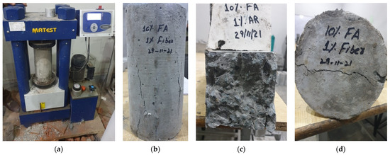 In this study, the MATEST brand machine with a maximum loading capacity of 2000 kN shown in Figure 3 was operated for the evaluation of mechanical properties (e.g., compression, flexural and indirect split tensile, etc.) of AR glass fiber-fly ash concrete. The curing of specimens was carried out for 7 and 28 days. For compressive and indirect split tensile strength tests, a cylinder with a size of 150 mm × 300 mm was cast. Meanwhile, beams with a size of 100 mm × 100 mm × 500 mm were cast for the flexural strength test. The curing and testing of specimens were conducted according to ASTM standards. The compressive and indirect split tensile strength test was conducted at the loading rate of 5 kN/s as per ASTM C-39 and C-496 [71,72]. Similarly, the third point load flexural strength test was conducted at a loading rate of 1kN/s as per ASTM C-78 [73]. For a single type of testing, a total of three specimens were prepared for every concrete mix at 7 and 28 days, respectively. Then, the average of the three specimen values counted as the final value of that experiment.