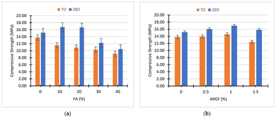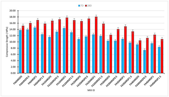 The outcomes presented in Figure 4b demonstrate strong agreement with previous studies conducted by Swami et al. [74], and Hilles et al. [75] determining the behavior of glass fiber reinforced concrete composites. According to Swami et al., a small percentage of fibers significantly increases the compressive strength of concrete. Conversely, the compressive strength did not increase when the percentage addition of fiber was superior to the fibers optimal value, as shown in Figure 4b and Figure 5. In this study, the fiber optimal value can be noted at 1 percent fiber addition, as revealed in Figure 4b. Hilles et al., who used glass fiber to study the mechanical properties of high-strength fiber reinforced concrete, show that the optimal value of glass fiber was achieved at 1.2 percent addition. The mutual effect of FA and ARGF on the compressive properties of concrete at 7D and 28D curing is illustrated below in Figure 5.