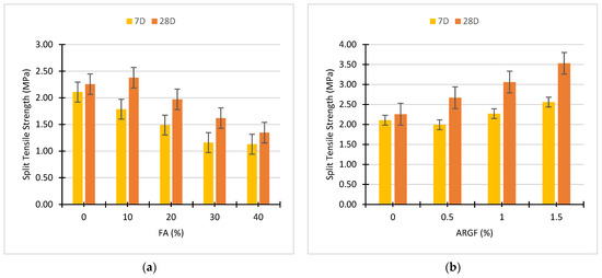 This section discusses and explains the performance of FA and ARGF on the split tensile properties of each concrete mix ID. Firstly, the individual performance of FA and ARGF at 7D and 28D curing is demonstrated in Figure 6. At 28D, the split tensile strength of concrete containing 10% FA increases around 6% compared to the reference concrete mix. Further replacement of cement with FA declines the split tensile strength of the concrete after 28D curing. The impact of fly ash on split tensile strength is negative, as shown in Figure 6a. At 7D, fly ash concrete gains less strength in contrast to the reference mix. Only a minor enforcement in tensile strength is noted at 28D strength of FA10ARGF0 mix ID. Similar findings were reported by Akhtar et al. [14] at 10% incorporation level of fly ash. They stated that further incorporation declined the split strength of concrete. However, owing to slow pozzolanic activity, split tensile strength decreased at a higher-level incorporation of fly ash [23].