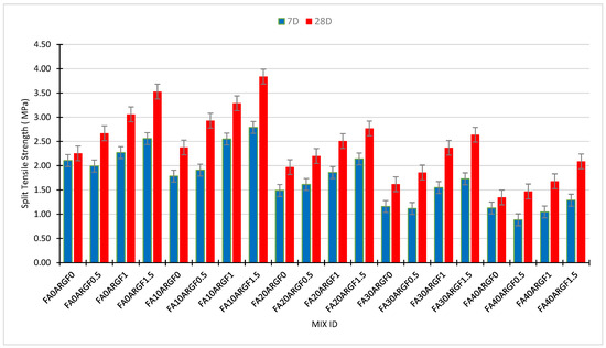Figure 6b demonstrates the separate effect of ARGF on the split tensile strength properties of concrete mix at 7 and 28D curing. The 28D highest strength around 3.53 MPa obtained at 1.5% addition of ARGF. This value of 1.5% ARGF concrete is 56% higher than the reference concrete mix. On the other hand, 28D lowest split tensile strength approximately 2.30 Mpa noted at 0% addition of ARGF. Furthermore, 7D strength after the addition of 0.5% ARGF is almost equivalent to the reference concrete mix. All these outcomes show good agreement with previous studies conducted by Hilles et al. [75] and Swami et al. [74], who study the mechanical behavior of glass fiber concrete composites. Hilles et al. reported that the split tensile strength continuously increased as the fiber percentage varies from 0 to 1.2%. It was concluded that reinforcement of 1.2% glass fiber enhances the split tensile strength of concrete by around 63% compared to reference mix strength. Furthermore, Swami et al. reported that the split strength of concrete rises significantly with the addition of glass fiber, even when a large volume was utilized. Current study outcomes shown in Figure 6 and Figure 7 illustrate a good relationship with previous studies. The mutual effect of FA and ARGF on the split tensile properties of each concrete mix at 7D and 28D curing is illustrated in Figure 7.
