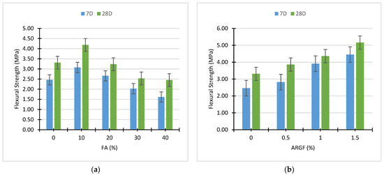 This section explains the flexural strength behavior of each concrete mix at the age of 7D and 28D curing. Figure 8 illustrates the individual effect of FA and ARGF on the flexural properties of concrete mixes at both curing ages. The flexural strength of FA concrete is shown in Figure 8a which elaborates their 7 and 28D performance at each percentage of replacement. The results reveal that the 10% FA concrete gains maximum strength as a contrast to all FA concrete mixes at both curing ages. For 30 and 40% FA concrete mixes, the 28D strength results are almost equal. Especially, the strength of reference concrete and 20% FA concrete are equal. This observation was also noted in the outcomes of compression and split tensile strength testing. Previous studies such as Akhtar et al. [14], Ali et al. [76] and Chindaprasirt et al. [26] also reported similar findings for fly ash concrete specimens.