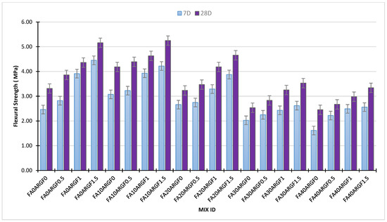 Moreover, the strength outcomes of ARGF concrete mixes are shown in Figure 8b. At each percentage addition of ARGF, the performance of the concrete mix is successfully improved. The maximum results were obtained at 1.5% addition of fiber that was greater than 5 MPa. The strength of the 1% ARGF concrete mix is almost the same at both curing ages. Current outcomes of ARGF concrete are like previous studies conducted by Hilles et al. [75], and Swami et al. [74]. All these studies reported that, as the percentage of glass fiber rises, the flexural strength of concrete rises simultaneously. Hilles stated that flexural strength enhances around 53% at 1.2% addition of glass fiber. Similarly, in this study, flexural strength rises almost 56% at 1.5% addition of glass fiber. Moreover, the resistance of a material against cracking under tensile load increases after the addition of fiber [74,75,76]. For a better understanding of the mutual effect of FA and ARGF, the outcomes of each concrete mix are illustrated in Figure 9 below.