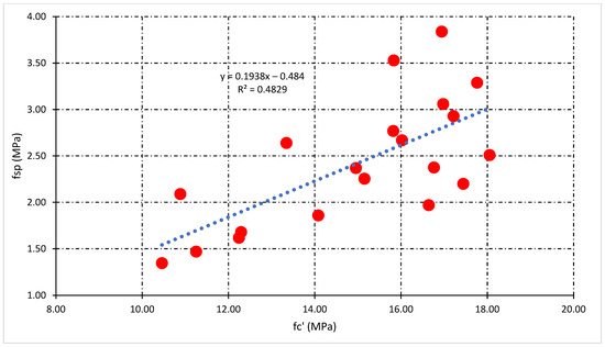 This section illustrates the statistical relationship between the mechanical properties of concrete. The general relationship among compressive strength (fc’), split tensile strength (fsp), and flexural strength (fr) for all types of concrete mixes was also investigated. Moreover, the statistical relationship which includes the percentage of fiber (Pf), fc’, fsp, and fr helpful for the prediction of mechanical properties of fly ash fiber reinforced concrete. Figure 10 and Figure 11 demonstrate the statistical relationship between fc’ and fsp. Figure 10 shows the general relationship for all concrete mixes, but Figure 11 shows the relationship only for fly ash fiber reinforced concrete that included the percentage of fiber (Pf). Results show that the general relation is comparatively weaker than the relationship generated by the addition of fibers. This confirms the positive effect of fibers on the split tensile properties compared to compressive strength properties. A similar relationship can be developed among fc’and fr demonstrated in Figure 12 and Figure 13. Statistical analysis reveals that the general relationship was found to be very weak among fc’and fr in contrast to the relation that originated by the addition of fibers. In the end, the relationship demonstrated in Figure 14 can develop among fsp and fr for all concrete mixes.