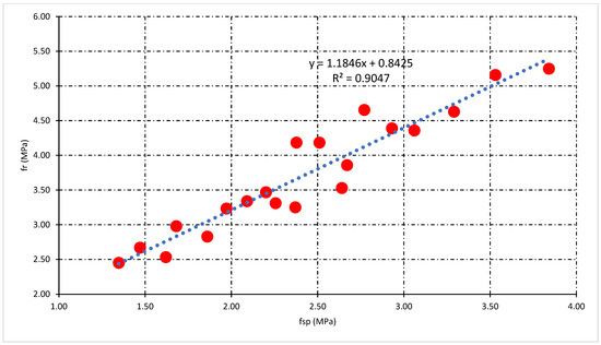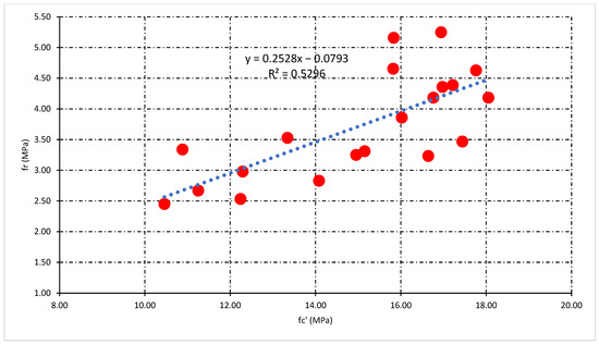 Figure 11 reveals that the highest value of R-square was obtained at 10% FA, while the lowest was obtained at 40% FA fiber concrete mixes. Additionally, the impact of fibers on fsp and fc’ can be tested through this statistical analysis. The above statistical equations will help forecast the mechanical properties of fly ash fiber reinforced concrete. Moreover, in the case of flexural strength analysis, the lowest value of R-square was obtained at 40% FA and the highest obtained at 20% FA fiber reinforced concrete mixes, as shown in Figure 13. However, the overall analysis of mechanical properties of fiber-reinforced concrete was found to be very good. A very strong R-square value of 0.90 was obtained during the general relationship analysis of split vs. flexural strength.