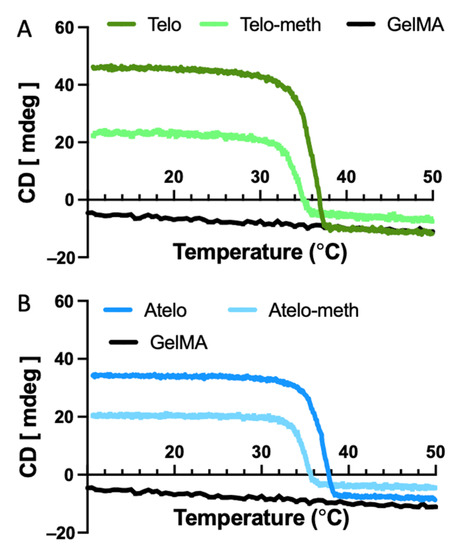 Thermal denaturation of collagens and modified collagens measured using CD spectroscopy at 222 nm. (A) Telo-collagen and methacrylated telo-collagen. (B) Atelo-collagen and methacrylated atelo-collagen. In both cases, the modified collagens showed the lower stability.