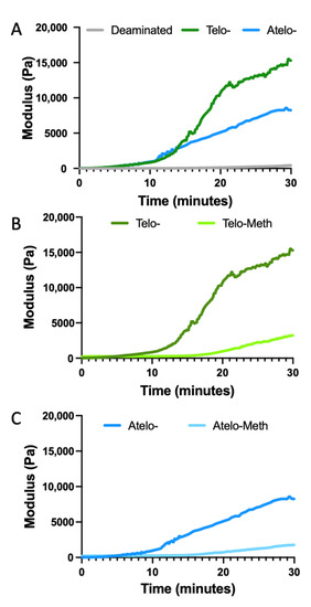 Turbidity has frequently been used to study the formation of collagen gels by heating cold, neutral solutions to 37 °C [11,25]. Studies have demonstrated a lag phase (where no change in modulus occurred as molecules heated and began or organise), of around 10 min, depending on the conditions, which suggests that fibril nucleation occurred, followed by an increase in turbidity as fibril formation, thickening and growth continued [26,27]. In the present study, however, photo-rheology was used as it enables quantifiable changes in viscosity and modulus following the irradiation of methacrylated collagen samples for observation. This approach was validated using samples of telo-, atelo- and deamidated telo- rat tail type I collagen (Figure 3A). These rheological data showed that the telo-collagen exhibited rapid gel formation, after a lag period of about 11 min, following the increase in the temperature from 4 to 37 °C, which was consistent with the turbidity data. By contrast, the atelo-collagen showed slower gelation after an extended lag period. The data for the deamidated collagen showed that little, if any, fibril formation or association occurred (Figure 3A). Thus, the absence of the telopeptides significantly decreased both the rate of fibril formation and the modulus that was obtained after 45 min by almost 50%.