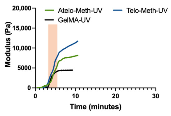 Rheological examination of photo-crosslinking kinetics of methacrylated telo-collagen and methacrylated atelo-collagen, following exposure to UV irradiation. The orange bar represents the UV exposure period.