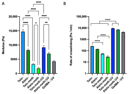 The methacrylation of both collagen samples resulted in a reduced rate of viscosity increase during the thermal gelation process. This was most notable for the methacrylated telo-collagen (Figure 3B), where the reduction in the change in viscosity was about 80%, falling to a level that was much lower than that of the unmodified atelo-collagen. However, the extent of the reduction upon ~50% methacrylation modification was less than for the deamidated collagen where limited, if any, fibril formation occurred. There was also a reduced change in viscosity for the methacrylated atelo-collagen of about 80%, giving a particularly low value as the original unmodified material showed a limited viscosity increase over the 45 min of heating (Figure 3C). In all cases, except for the deamidated collagen, visual inspection found that some form of gel formed, although these forms were typically weak, except for the unmodified telo-collagen, which formed a firm gel. The change in modulus after UV irradiation of the methacrylated collagens was much more rapid (Figure 4), reaching comparable modulus levels around four times more rapidly than any of the thermally gelled materials. A summary of the rheological data indicates that statistically significant differences changes were found when different materials were examined (Figure 5).