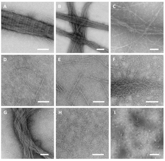 TEM of collagens, methacrylated collagens and GelMA samples after thermal and UV-induced gelation. (A) Telo-collagen. (B) Telo-collagen. (C) Atelo-collagen. (D) Methacrylated telo-collagen without UV irradiation. (E) Methacrylated atelo-collagen without UV irradiation. (F) Methacrylated telo-collagen with UV irradiation. (G) Methacrylated atelo-collagen with UV irradiation. (H) GelMA without UV irradiation. (I) GelMA with UV irradiation. Bars = 100 nm, excepting (B,F), where Bar = 200 nm.