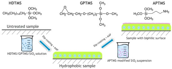 A novel environment-friendly method to prepare nanofiltration membranes for highly efficient separation of water-in-oil emulsions was reported by Yang et al. [22], where durable biphilic (oleophilic and hydrophilic) surface was prepared by atmospheric air plasma treatment of cellulose filter paper followed by various grafting procedures. The hydrophobic surface with a microscale hierarchical structure was constructed using long-chain alkyl silane grafting. The authors utilized silanization by acting aminopropyltrimethoxy silane (APTMS), glycidyl propyl trimethoxy silane (GPTMS) and hexadecyl trimethoxy silane (HDTMS) onto plasma-activated SiO2 nanoparticles using surface chemistry approach as shown in Figure 2. The samples exhibited excellent separation performance for surfactant-stabilized water-in-oil emulsions with the filtration efficiency of up to 99% and the oil recovery purity > 99.98 wt%. As shown in Figure 2, the water-amine attraction (for APTMS functionalized layers) and oil-alkyl attraction (for the GPTMS side) synergistically destabilize the emulsion and separate the two phases. The formatted coating was very durable against ultrasonication in acetone and can be stored for 12 months without degradation upon aging. The coating also exhibited excellent recyclability (over 20 cycles), although the multi-step process is too complicated and not cost-effective for large-scale application.