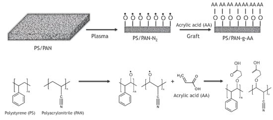 PS/PAN membrane modification by acrylic acid grafting using plasma activation by grafting of radical Oxygen species (O*).