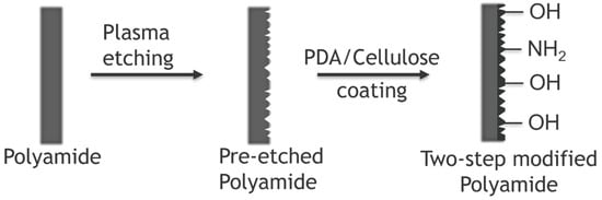 The economic aspects for the oil/water separation play a crucial role in the evolution of produced water treatment technology. Often cost-effective reusable materials with lower performance may have gained economic benefits against polymeric membranes based on PVDF, fluoropolymers, polysulfone, or other expensive materials. Hence cheaper feedstock material can play a crucial role in reducing costs and enhancing the business value for membrane oil/water separation. In this regard, the two-step surface modification of polyamide meshes and nonwoven fabrics for oil/water separation investigated by Zhao et al. attracted extreme attention from the scientific community [45]. Their methodology was based on pre-etching the polyamide surface using plasma treatment and coating of a pre-etched surface by eco-friendly polydopamine (PDA)/cellulose, as shown in Figure 5. The pre-etching increased the surface roughness, which further improved the underwater superoleophobicity of the coating. Therefore, the modified polyamide separated various oil/water mixtures and showed a higher intrusion pressure than the original sample and the samples, which were only etched or coated. The grooves on the surface that resulted from the pre-etching prevented the coating from peeling off. In durability tests, after six repeated uses, the modified nonwoven sample lost its underwater oleophobicity due to severe oil fouling, coming to a complete failure in oil/water separation. After 19 cycles, the modified mesh could still separate a certain amount of oil/water but showed reduced intrusion pressure because of slight oil contamination. Filters with different structures, like meshes with one layer of pores and nonwoven fabrics with complex three-dimensional pores, had different oil fouling levels that affected oil/water separation. The recoverability of filters from oil contamination should be considered for practical applications.