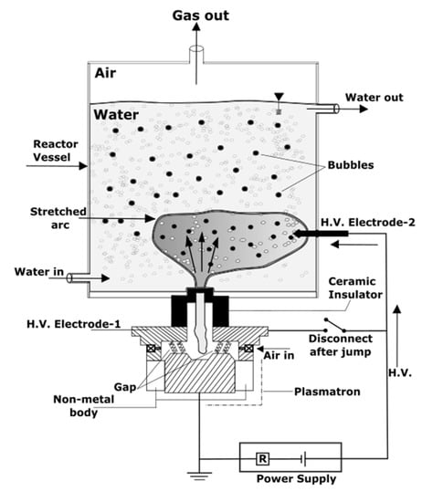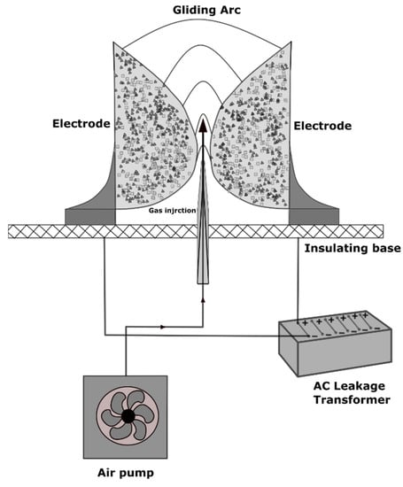 Atmospheric pressure discharges can directly decompose the organic pollutants. The decomposition of model organic pollutants: chloroform, benzene, and methanol through the gliding arc (GA) plasma technology was reviewed by Gong et al. [48]. The conventional GA reactor is depicted in Figure 6. It is equipped with an AC power supply and flat electrodes contributing to the dispersion of heat and restriction of the gas flow. When a high voltage is applied, the gas flow initiates the GA plasma.
