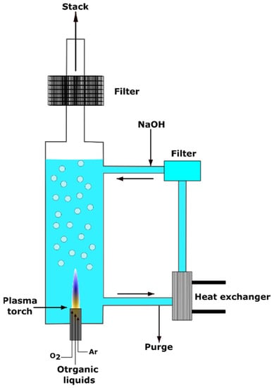 Millie et al. and Lemont et al. designed a plasma tool ELIPSE to decompose organic impurities in water using an atmospheric plasma torch [56,57]. The ELIPSE process is a novel technology of organic liquid destruction involving a thermal plasma working under a water column, ensuring the cooling, filtration, and scrubbing of the gases coming from the degradation (Figure 9). The ELIPSE demonstrated the ability to destroy the pure organic liquids and then eliminate the organic compounds remaining in the aqueous solution through plasma’s thermal or radiative properties. Preliminary tests have shown how efficient the process is to destroy the organic liquids when they are directly fed in the plasma. By applying plasma for 60 min, the concentration of organic contaminants decreased from 1200 to 400 ppm.