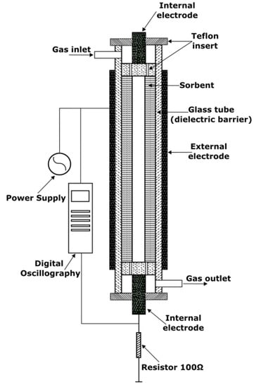 The increase of the water quality purification related to the final use of the treated water might be extremely challenging to achieve in an economically viable scenario if a single technology is used (e.g., only sorption or filtration). However, the researchers recently implemented an exciting approach based on a combination of various techniques: plasma and sorption of membranes and photocatalysis. These combination approaches allow separating or adsorb parts of the pollutants and decomposing the rest of the contaminants. For example, Gushchin et al. developed a combined process involving the sorption of oil (C22H38) on a sorbent (diatomite) followed by regeneration of the sorbent by plasma-oxidative destruction in an atmospheric dielectric barrier discharge (DBD) [60]. The reactor depicted in Figure 10 was composed of a glass tube diameter of 22 mm, which served as a dielectric barrier; the outer electrode was made from the aluminum foil and located outside the glass tube, and the internal electrode, a 15 mm diameter aluminum rod. The sorbent was placed inside the reactor along the length of the discharge zone.
