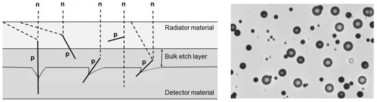 Historically, in the late 1950s, it was discovered that when mica is exposed to energetic charged particles, these leave latent traces in the material at the atomic scale. It soon became apparent that glass, polymers, or certain other materials can be treated in the same way. Solid-State Nuclear Tracks Detectors (SSNTD) record their passage when their properties are compatible with detection energy thresholds [19] and they are detected via the observation of the nuclear traces created. These damage traces can be revealed and made visible in an optical microscope by treatment with a properly chosen chemical reagent that rapidly and preferentially attacks the damaged material. It removes the surrounding undamaged matrix less rapidly so as to enlarge the etched holes that mark and characterize the sites of the original, individual damaged regions. Fleisher et al. [20], illustrated the envisioned model of track formation in polymeric solids and sketches how etching proceeds for different tracks. The shapes of the etched tracks result from the simultaneous etching of undamaged material at a general rate vG and the accelerated rate vT along the track. The pits that result have a V-shaped cross-section as sketched, and, therefore, in three dimensions are conical with an angle θ = sin−1 (vG/vT).Figure 1 shows an illustration of a typical process related to each bit generation in the case of neutron detection [21]. In a previous work [22], polymer SSNTD type CR-39 was irradiated with both 241Am alpha particles and protons in the energy range of 1.0–5.5 MeV and 0.8–2.8 MeV, respectively. The proton irradiation was made by two different techniques: Rutherford Backscattering and Nuclear Reaction. The track diameter variation as a function of particle energies and etching time has been studied. A predictive model based on experimental track parameters has been developed for the studied particles and for variable bulk track etching velocities vT. Figure 1 (right) shows the proton tracks observed by an optical microscope after chemical etching. The counting of the number of traces per unit area to provides the number of incident particles.