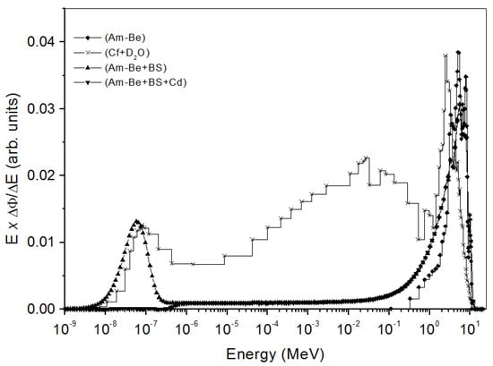 Neutron spectra emitted from 241Am−Be, 241Am−Be + BS, (241Am−Be + BS + Cd), and (252Cf + D2O) sources. BS is Bonner Sphere.