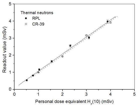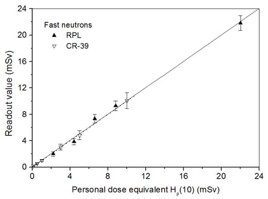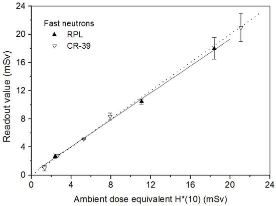 Figure 3 shows the linearity of RPL and CR-39 detectors to an ambient dose equivalent to H*(10) in the range of 1.3 to 22 mSv of the IPHC 241Am-Be neutron source. The dose value on the ordinate was obtained from the calibration factor of each type of detector and their readout at the corresponding dose. The direct proportion is observed between the irradiation dose and readout of detectors.