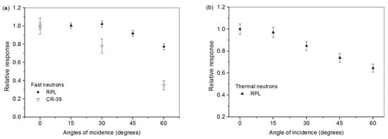 Angular variations of the RPL and CR-39 detectors: (a) fast neutrons; (b) thermal neutrons.