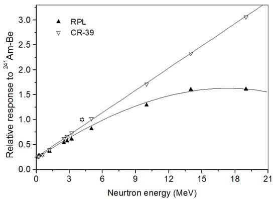 Neutron dosimeters are conveniently calibrated in reference fields of 241Am-Be and 252Cf, and the results are used to evaluate the dose from other neutron beams. It is important to know the energy dependence of the dosimeter response. For neutron energies from 0.144 to 19 MeV [32], the response at normal incidence was computed. Figure 7 shows simulated relative responses of both detectors corresponding to the (n, p) recoil proton fluence per unit dose. The relative responses are normalized to the responses with the 241Am-Be neutron field (average energy fluence 4.16 MeV). We observed that the CR-39 relative response to 241Am-Be varies linearly with the energy up to 19 MeV. This is explained by the fact that the bare CR-39 itself is a fast neutron converter. El-Sersy [43] showed that the number of induced recoils in CR-39 detectors depends on the neutron energy. On the other hand, the RPL response shows a slight dependence on neutron energy beyond 4.16 MeV. Therefore, the difference with the CR-39 in energy dependence in the detector responses beyond this energy might be attributed to their different compositions.