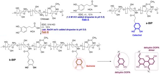 The catechol group of HCA is a well-known organic moiety, which is pH-sensitive and can be easily oxidized to its highly reactive quinone form at a pH above 5.5. The quinone spontaneously undergoes irreversible polymerization to form dicatechol dimers and covalent crosslinking networks [,,,]. Therefore, controlling the pH during the reaction is crucial for preparing polymers with exact functional groups. The BIPs were synthesized by the EDC-mediated amide coupling reaction of chitosan and HCA under slightly different acidic conditions (Figure 1). Interestingly, the final products depend on the methods used to maintain the pH near 5.0, such as the dropwise addition of the acid (Figure 1, Path A) or base (Figure 1, Path B) solutions. Due to the susceptibility of catechol toward oxidation, covalently crosslinked b-BIP was obtained via path B using a saturated NaOH solution, whereas a-BIP with complete catechol was obtained via path A using HCl solution.