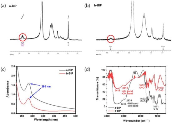 Qualitative analysis of BIPs: 1H-NMR spectra of (a) a-BIP and (b) b-BIP; (c) UV–vis spectra of a-BIP (black line) and b-BIP (red line); (d) FT-IR spectra of a-BIP (black line) and b-BIP (red line).