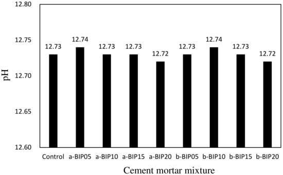 Figure 4 shows the change in the pH of the cement mortar mixture samples according to the type and amount of BIP used. The pH of the a-BIP20 and b-BIP20 mixtures was 12.72, which was slightly lower than that of the control sample. Irrespective of the type and amount of BIP used, all the samples exhibited similar alkalinities with pH levels in the range of 12.72–12.74. Therefore, it was concluded that the type and amount of BIP do not affect the pH of the cement mortar significantly.