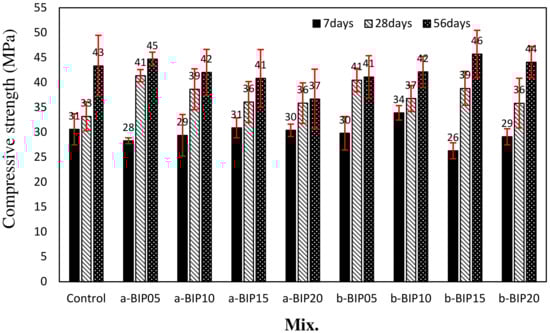 - After 28 days of aging, the compressive strength of the control sample was ~33.2 MPa. The incorporation of BIPs improved the compressive strength to the range of ~35.9–41.4 MPa. In particular, the highest compressive strength of ~41.4 MPa was exhibited by the a-BIP05 sample.