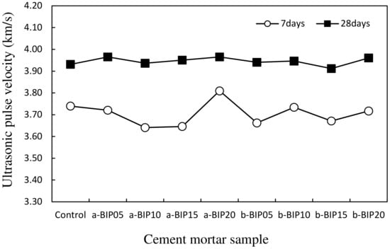 Figure 6 shows the ultrasonic pulse velocities across the different cement mortar samples. The velocity range for the samples was 3.64–3.81 km/s after 7 days of aging, and increased slightly to 3.91–3.97 km/s after 28 days, suggesting densification of the cement matrix as the hydration reaction of cement progressed. Although the velocity across the 28-day samples was approximately 4.1–7.4% higher than that across the 7-day samples, there was no clear difference among the samples in terms of the BIP type or content.