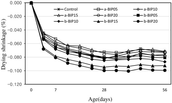 - After 56 days, the drying shrinkages of the samples containing a-BIP were in the range of ~0.072–0.078%, lower than that of the control sample (~0.076%), except for the a-BIP20 sample (0.078%). When b-BIP was used, the drying shrinkage increased to ~0.081–0.099%, which was ~6.5–30.2% higher than that of the control sample.