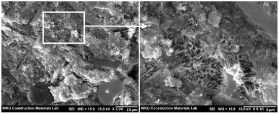 Since the drying shrinkage in these samples was large in the initial age, the drying shrinkage value after 56 days was higher than those of the other samples. The observed large drying shrinkage during initial aging in some samples containing BIP seemed to be due to the aforementioned self-aggregation phenomenon. It is likely that the self-aggregated materials generated due to the use of a large amount of polymer acted as defective regions, thereby reducing the strength and increasing the available space for shrinkage in the cement matrix. This was confirmed in the SEM images (Figure 9) of the 7-day-aged b-BIP20 sample.