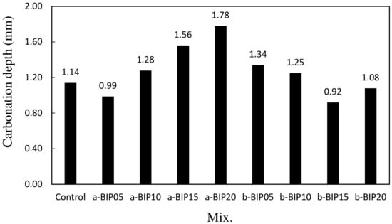 - After 28 days of accelerated carbonation, the carbonation depth of the control sample was ~1.14 mm, and the carbonation depth inversely correlated to compressive strength. The lowest carbonation depth (0.99 mm), and therefore, the highest compressive strength was obtained in the sample with 5% a-BIP (a-BIP05).