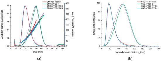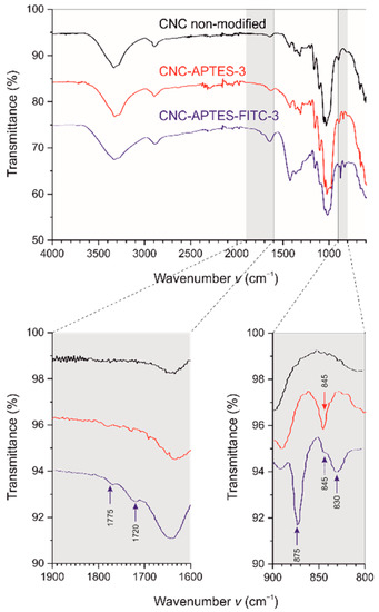 3.2.3. Separation of CNC-APTES and CNC-APTES-FITC from Supernatants