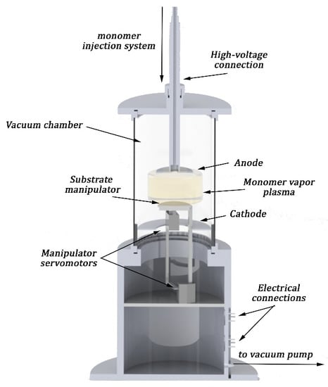 In order to obtain thin iron-oxide-doped polyaniline films, a setup made up of a vacuum pump, vacuum chamber (3000 cm3), two parallel mounted inner circular electrodes, and an inlet system were used. A similar setup was involved in the generation of PANI films with different morphological and structural proprieties [1]. A schematic representation of the deposition setup is shown in Figure 1.