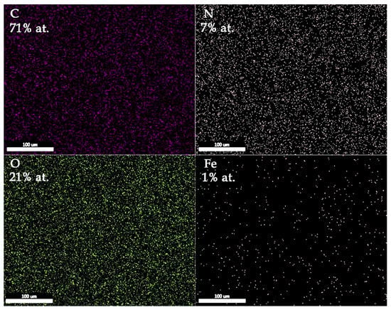 The SEM-EDS elemental mapping results of the PANI-IO coating are presented in Figure 3. The C, N, O, and Fe elements were uniformly distributed on the analyzed area of 100 × 100 µm2. The atomic concentrations of film constituents are also highlighted in the image.